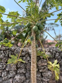 パパイヤというと黄色やオレンジのフルーツとしての実を想像されると思いますが、沖縄のパパイヤはこの青い状態が収穫時!細かく千切りにしてシーチキンなどと炒めて食べるのが一般的ですね(*^^*)