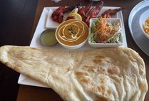 香ばしく焼き上げられた大きなナンに、コクのあるカレー、スパイスが効いたタンドリーチキンを添えて、サラダとソースも付いて、ボリューム満点ながらバランスの良い一皿でした。