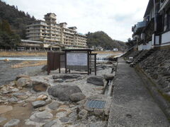 三朝温泉街の間を流れる三朝川の河原にある温泉場です。三朝橋と三朝小唄歌碑の間にある石段を下りて行くようになっています。浴槽と足湯があり、足湯は橋の上からよく見えるものの、浴槽は衝立が隠しますので橋から丸見えにはなりません。でも他の角度からは見えてしまいますので、水着などを着て入った方がいいでしょう。
