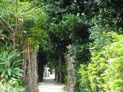 駐車場に車と停めてしばしの散策タイム。備瀬には昔ながらのフクギ並木の景観が残っています。静かな緑のトンネルをのんびりと歩く幸せ。フクギに囲まれた集落の中はとても静かで、せわしない日常から別世界に足を踏み入れたようでした。