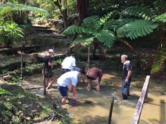 最初は乗り気ではなかったがガイドさんの説明と泥染職人さんの丁寧で面白い感じのアドバイスでだんだんとのめり込まれていきます。