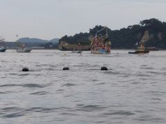 丁度「塩竈みなと祭」の「神輿船パレード」が行われていた。吹き流し、のぼり、大漁旗などで飾られた漁船のパレードはすばらしいものだった。
