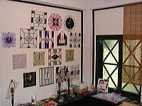 1階はギャラリーになっており、チェリ工房で制作した金唐革の額装やガラスの