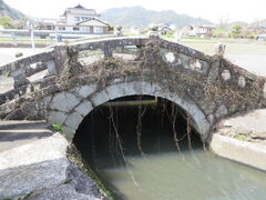 吉浦神社の鳥居前に、古い石橋がかかっています。小さな石橋ですが、現役の人道としても利用されているようです。綺麗なアーチの下は、水路になっています。