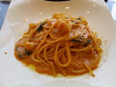 小エビと貝柱のトマトクリーム。後味さっぱりの濃厚ソースで美味しい!
