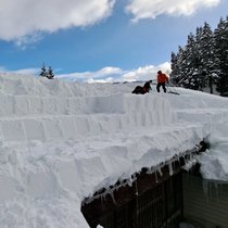 石を切り出すかの如く雪を切り出し運んで下ろしています。