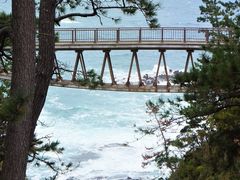 展望橋から見下ろす遊覧船乗り場。白波が打ち寄せ進入禁止でした。