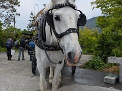 出発前に馬の横で写真を撮ってくださいました。3歳のお馬さん、パワフルで大変可愛かったです。ホロ付きなので陽の光は多少遮られます。風もありましたが、暑さはかなりのものだったので、水分必須です。