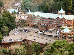 湯の山温泉街の奥の方、三滝川峡谷沿いの緑豊かな場所にあります。歩いて10分ほどの所に御在所ロープウェイの湯の山温泉駅があるので、ホテルの真ん前でゴンドラが行き交っているように見えます。客室から御在所岳の方を見上げると、断崖の上に立つロープウェイの白鉄塔や山上公園駅も見えます。