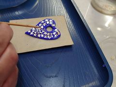 最初に形を選んで、次に色を選んで砂の様な物を解いた液?を爪楊枝みたいな棒でちょこちょこ乗せて、それが出来たら上にビーズやガラスのカケラをピンセットでつまんで乗せていきます。