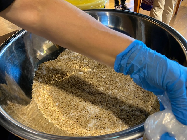 母の誕生日記念に甘酒と味噌作りの体験をしたのは初めてでした。足で大豆を踏むという楽しく味噌を作ったりしました。又教えて下さる人がとても楽しく話しながら作るのであっという間に時間が経って居ました。3ヵ月後お味噌が出来た時に楽しみです。ありがとうございました。