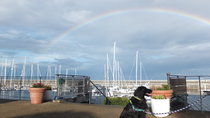 日が差し空が明るくなり海に目をやると虹がかかり、