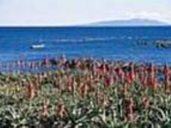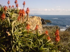 青い海をバックにアロエの赤い花が群生