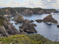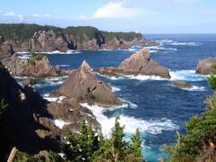 「海金剛(うみこんごう)」は、いくつもの鋭く切り立った岩礁が海面から突き出している景観は雄壮かつ神秘的です。南側の展望台から見るピラミッド型の岩礁が有名です。海が荒れ気味の時に、波が岩礁にぶつかって砕け散る景色が迫力満点とも言われます。「21世紀に残したい日本の自然100選」にも選ばれています。海金剛の名前は、朝鮮半島の名勝・金剛山に由来しています。