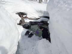 2月下旬にスノーシュー履いてスコップもって行ってみたところ、まだ入れる温度ではありませんでした。どうせまたすぐ来ると思ったので、男湯だけでなく女湯の方も、雪かきして適度な通路と、段差の階段を作っておきました。