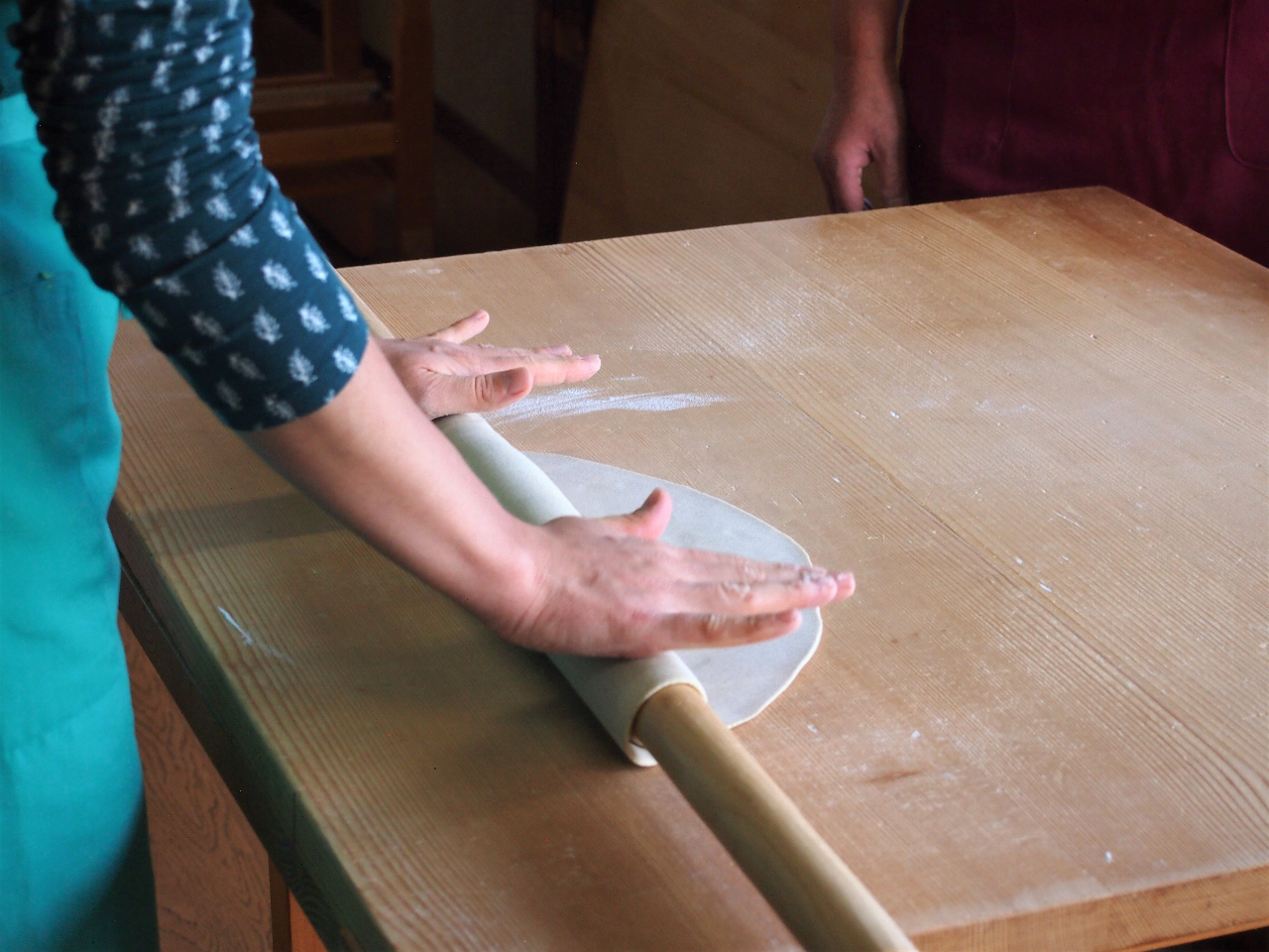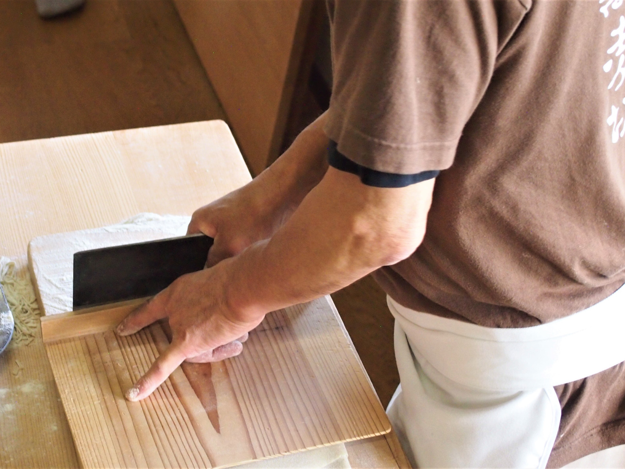 まず、そば粉を手でこねて丸くするところは体力が必要で、そこから、薄く伸ばして、細く切るところは慎重さが要ります。