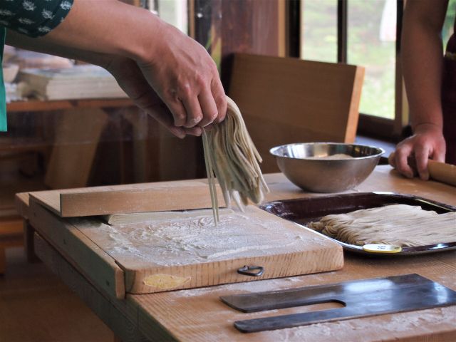 そば打ち名人が本場戸隠流そば打ちを伝授します。「一本棒丸のし」と呼ばれる、のし棒一本だけで打ち上げるお蕎麦で、打ったお蕎麦は大きなお釜で茹で上げます。自分で打った出来立てのお蕎麦は格別です。戸隠産そば粉使用。