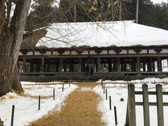 大雪が降った後に長床を訪れました。正面の参道に敷き詰められた黄色い銀杏とその周囲の白い雪とのコントラストが見事でした。