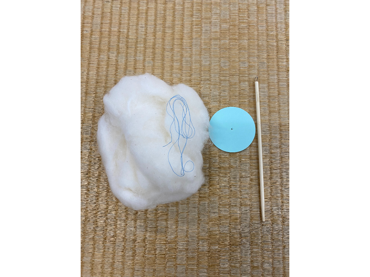 手作りのスピンドルを使用し、綿から糸にしていきます。