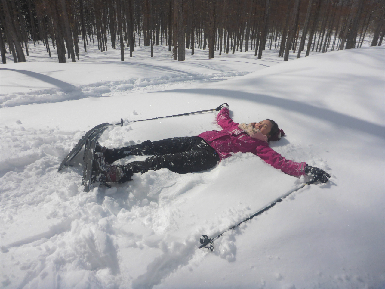 一言で言えば、雪の上を歩くための道具です。これを履いて、広い雪原や森林をハイキングします。ふっかふかの新雪も、急な斜面だってずんずん進めるので、真っ白い雪に覆われた世界を、冒険気分で楽しめます!