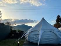 湯布院の山々を背景に、やさしい夕日がテントを包み込むこのひととき♪