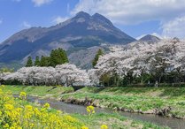 川沿いの桜が満開です!菜の花の黄色と桜のピンク、そしてドーンとそびえる由布岳!