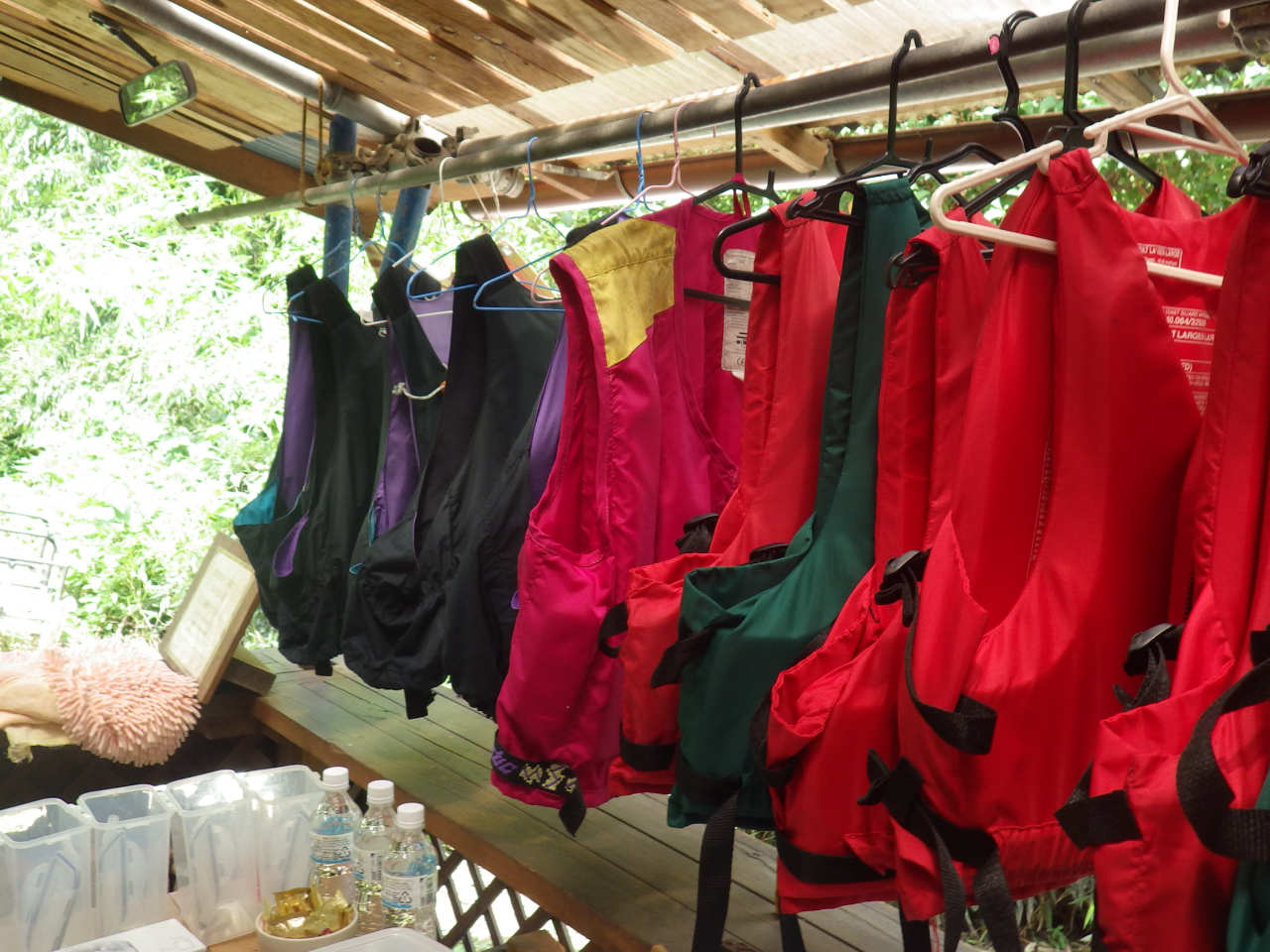 お子様用のかわいいライフジャケットも各種。大人用ライフジャケット男女別に分けています。使用後はケルヒャーで高圧洗浄、使い回しはありません。親子2人艇もあり。