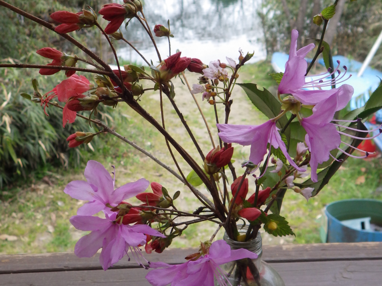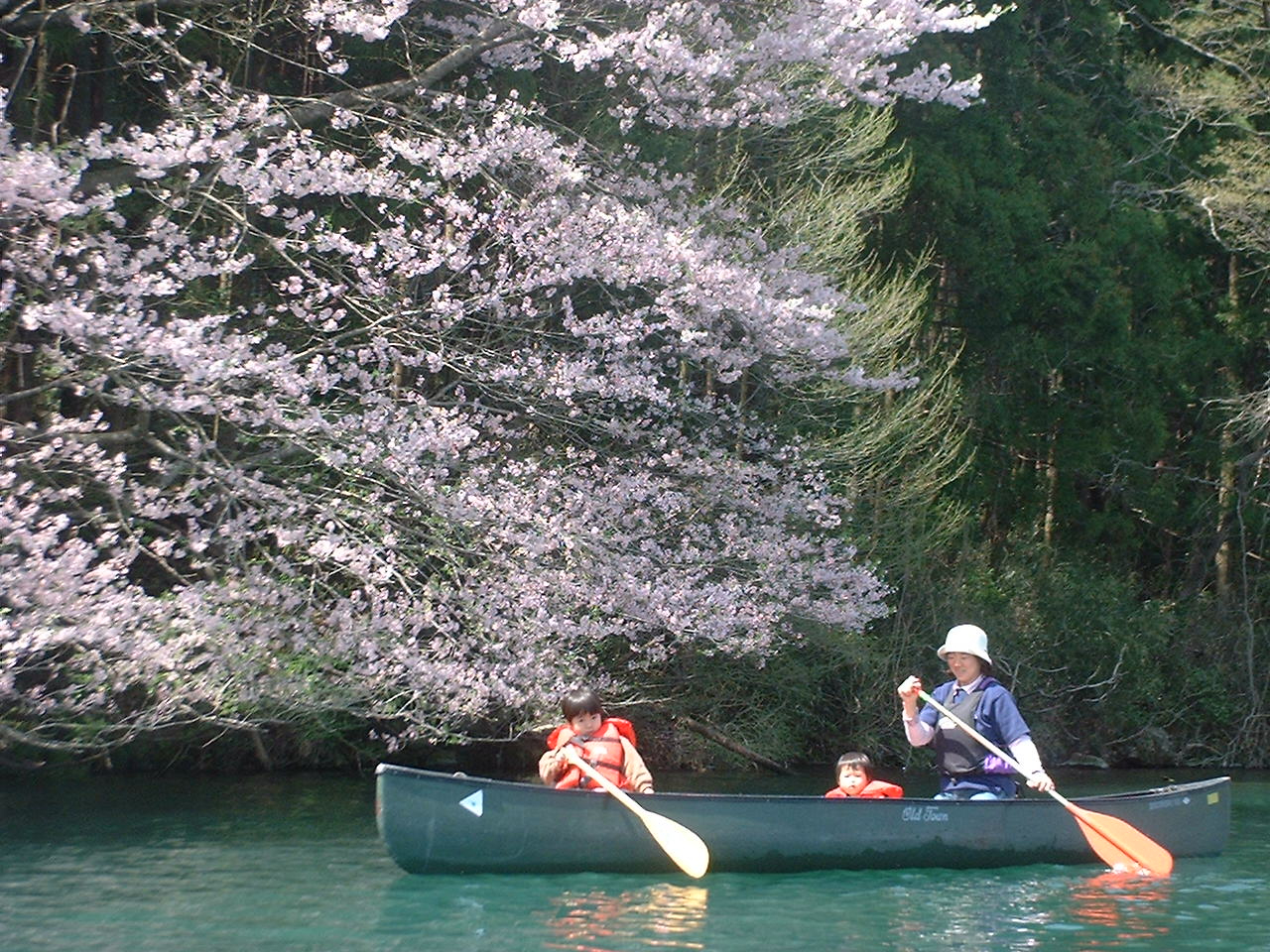 春のカヤック風景;山桜他、時期をずらしてウワミズ桜なども楽しめます。こちらは小学生、カナディアン2人乗りシングルブレードパドル。正式なカナディアンのスタイル。