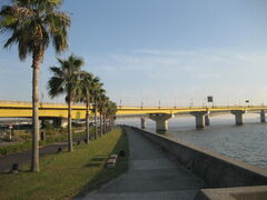 陽が傾き始め、連絡道路はオレンジ色に 橋の右奥に中部国際空港(セントレア)があります 名鉄の特急電車と車が利用できます