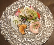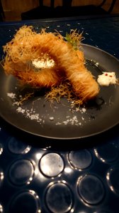 写真は天然エビのカダイフ巻きで、エビをカダイフという糸状の衣で巻いており、自家製のタルタルソースと共に味わえます!