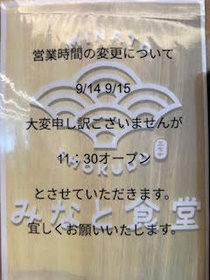 ★みなと食堂★9/14・9/15営業時間変更のお知らせ