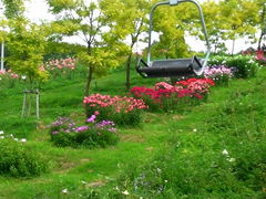 フクロウの森、アカシアの杜行きリフトで行くと、まさに黄金に輝くような鮮やかな色のアカシアが目に飛び込んでくる、小高いところから見ると湖の対岸等にも一部が輝いていた、リフト下山の斜面にはユリが多くあり一部が色鮮やかに咲いていた、ただ時期が少々早く、これからが見ごろを迎える