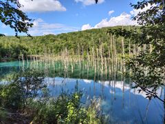 快晴の日の青い池は本当に美しかったです。念願だった美しい池を見ることができて大満足でした。路線バスの本数は少ないですが、バス停から近く便利でした。