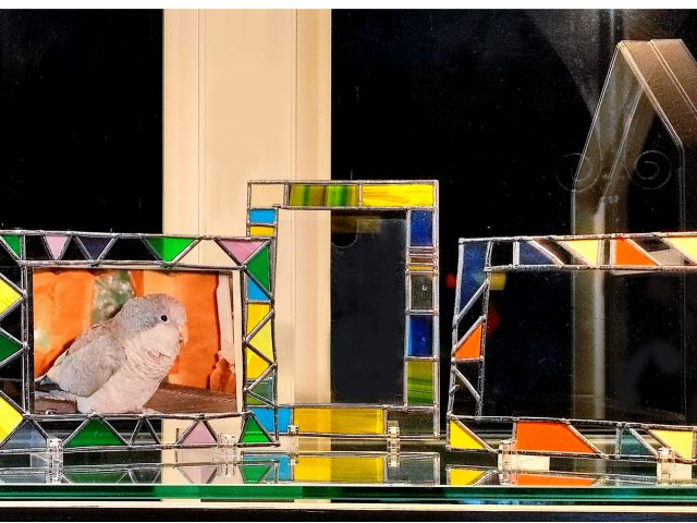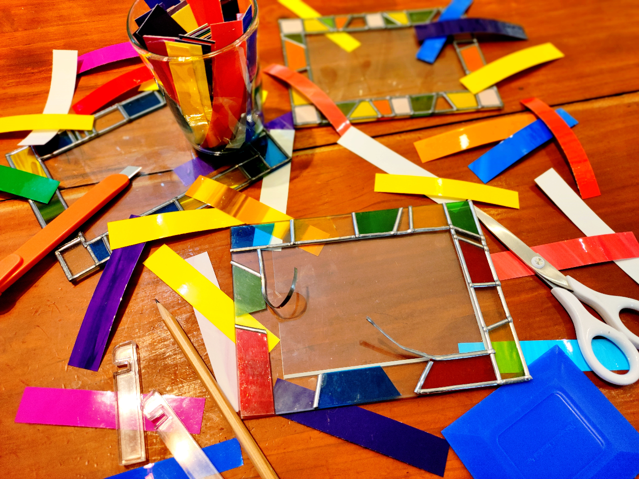 ガラスの板にステンドグラス風のシールと鉛線を張り付けて写真立てを作ります♪