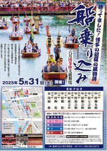 博多では「六月博多座大歌舞伎」の出演者らが、キャナルシティ博多で乗船式典を行った後、清流公園より数隻の船に乗り込み、川端ぜんざい広場前で口上を述べ、博多リバレインまでの博多川をゆっくりと進み、下船後に鏡天満宮を参拝します。