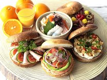 旬の魚介を使った海鮮丼や新鮮野菜とハムやサーモンを挟んだ焼き立てのベーグルサンドなどをメインとした和洋朝食ブッフェをご用意。