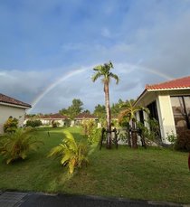 先日お休みの日にフサキビーチホテルさんへ行ってきたのですが、雨が一度あがったタイミングで海側をぼんやり眺めていたら――なんと空に大きな虹が!