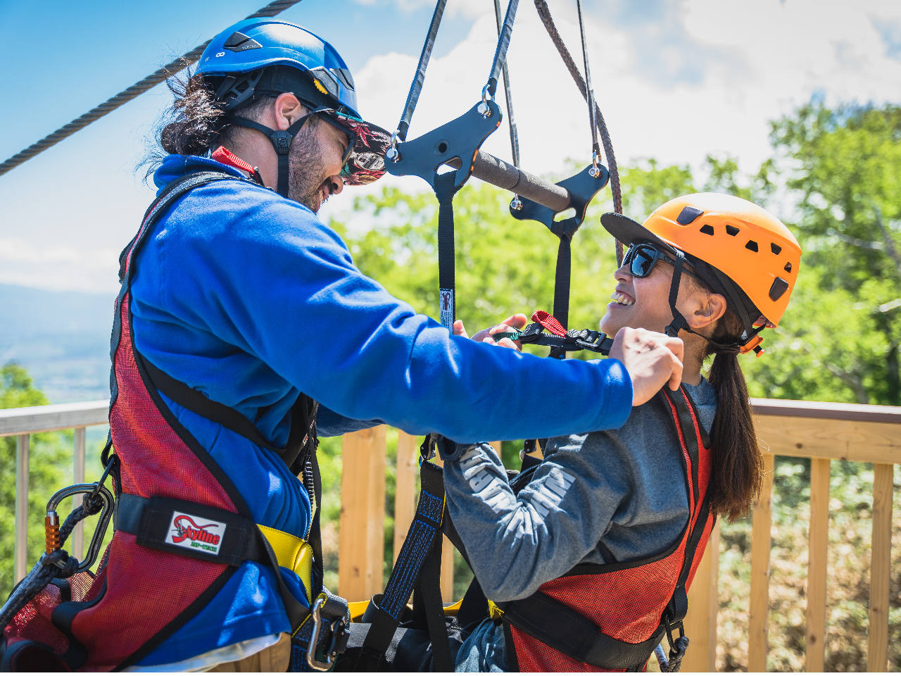 受付を済ませたらガイドと合流。ガイドと一緒にハーネスを装着し、スタート地点までゴンドラに乗って目指します!さらにお車に乗ってスタート地点まで移動しジップラインをご体験いただきます。