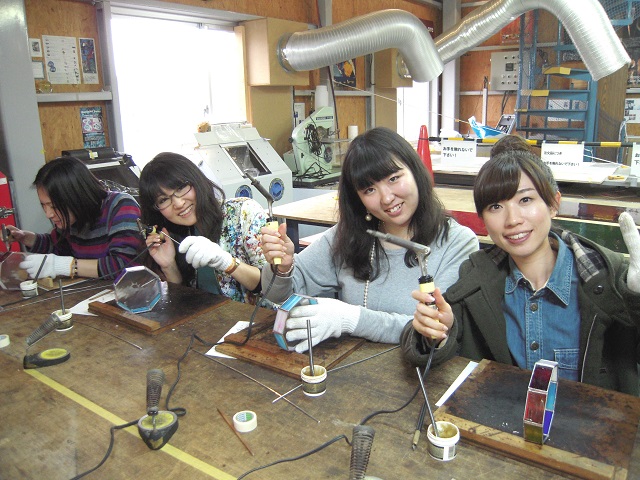 ガラス職人であるオーナーが体験教室の場としても工房を開放しており、とんぼ玉・ステンドグラス・サンドブラスト等の体験が出来ます。ショッップではプロの作家が作ったアクセサリーなどが常設、展示、販売されています。また、全国でも珍しいボロシリケイト制作体験も行なっております。理科学用などに使われる低膨張率の硬質ガラスを約2500℃の高温で溶かし、作業していきます。炎の中で模様が浮かび上がる様子は圧巻です。