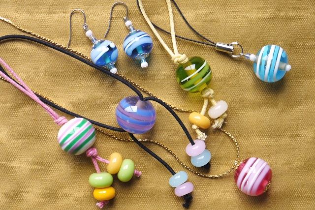 出来上がったとんぼ玉はネックレスやストラップなどお好きな金具につないでお持ち帰りできます。