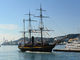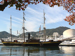 長崎港でひときわ目立っているのが、真っ黒な帆船「観光丸」。坂本龍馬や勝海舟たちが乗った船を復元したもので、特にファンには外せないクルーズですね。この船での軍艦島上陸クルーズもあります。