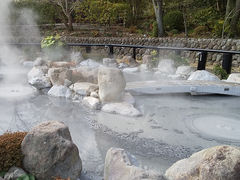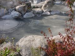 まずは海坊主地獄の近くの鬼石坊主地獄へ。それほど大きくはない地獄です。灰色の熱泥が沸騰する様子が坊主頭に似ているから坊主地獄という名前になったそうです。なんだか坊主ってより肌によさそうな地獄でした。隣接して温泉があるんですが、犬がいるから断念。