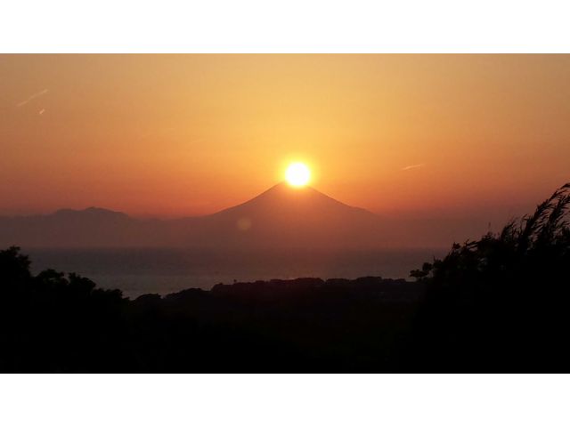油壷湾 :油壷湾の入り組んだ海の払い出しの先に、夕焼けに染まった空から浮かび上がる富士山が…
