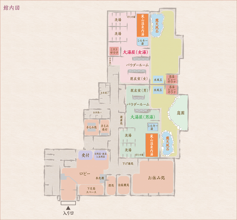 阪急嵐山駅からすぐの温泉です。靴を脱ぎロッカーのキーと交換です。27番キーはなかなかあきません。シルキー風呂、無色透明の温泉、露天風呂、ミストサウナ、小さめのサウナ、水風呂があります。バスタオルなどのレンタルは自販機で買うのですが並びます。