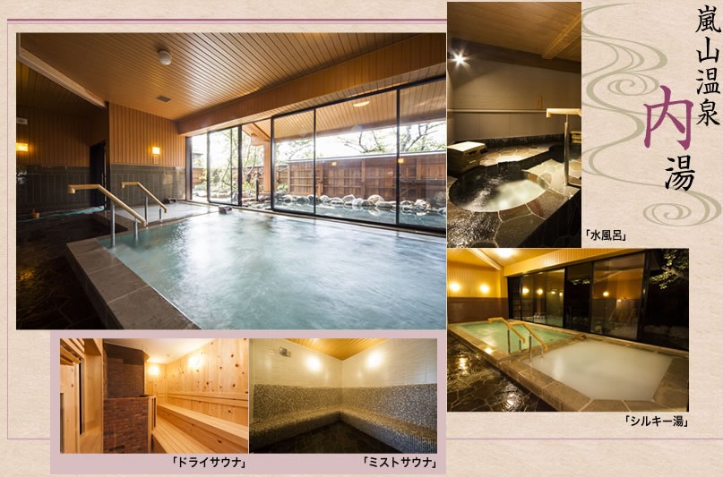 露天風呂、嵐山温泉の内湯、サウナ、シルキー湯などがあり、22時までご利用いただけますので