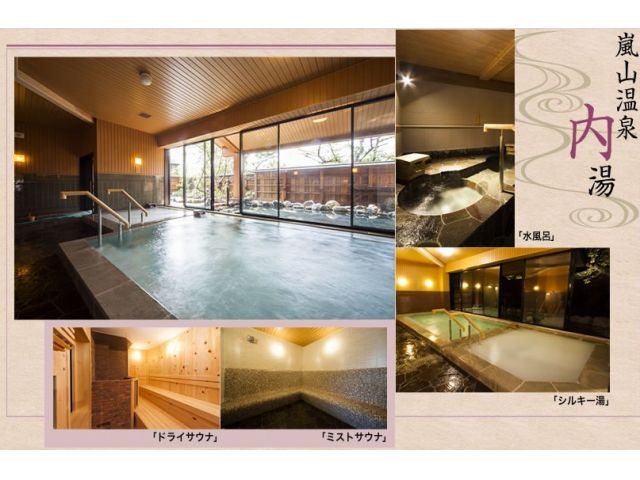 露天風呂、嵐山温泉の内湯、サウナ、シルキー湯などがあり、22時までご利用いただけますので、