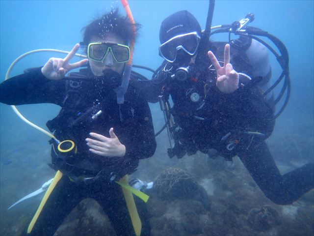 インストラクターと一緒に浅場でのスキル練習も楽しく安全に行っています。