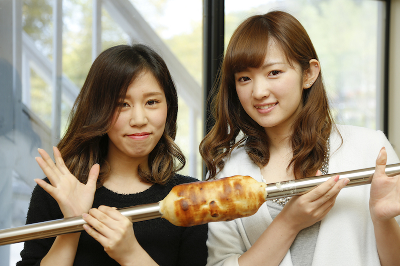 棒に生地をつけて二人一組でくるくる巻いて焼きます。