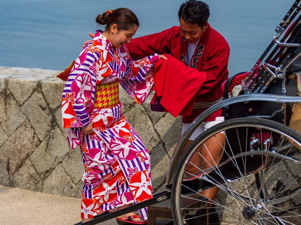 乗車場所・・・宮島桟橋(フェリー乗り場までお迎えにあがります!)〜海岸通リ〜大鳥居(大鳥居のなるほどガイド付き、、、ベストポジションでお写真撮ります☆)〜厳島神社(世界遺産厳島神社を人力車を降りて参拝。厳島神社社殿やお祀りされている神様について詳しく説明いたします)〜大願寺(日本三大弁財天大願寺を降りて参拝。弁財天や龍神の伝説についても詳しく説明いたします)〜滝小路(厳島神社の神職さんのお屋敷通リ、、、宮島で一番古い通リ)〜大聖院(宮島最古の寺パワースポット大聖院を人力車を降りて参拝。豊臣秀吉の守護仏「波切不動明王」について詳しく説明いたします)〜降車場所・・・表参道商店街or桟橋