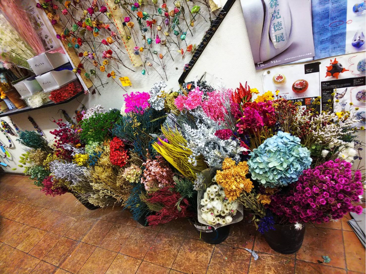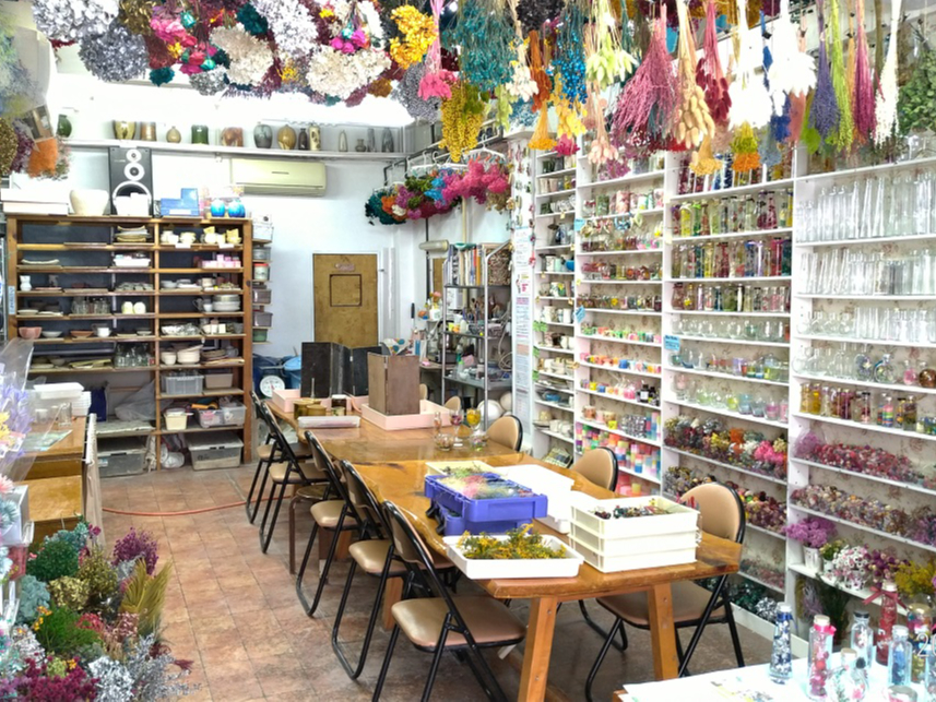 花材は約500種類!色々なものに使えます。ここでは老若男女、あらゆる年代の方に合わせた花材や材料を用意しております。ご家族やグループでもお越しください。